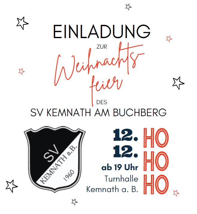 Am FR, 12.12.2025 ab 19:00 Uhr findet die Weihnachtsfeier des SV Kemnath a. B. wieder in der Turnhalle statt.